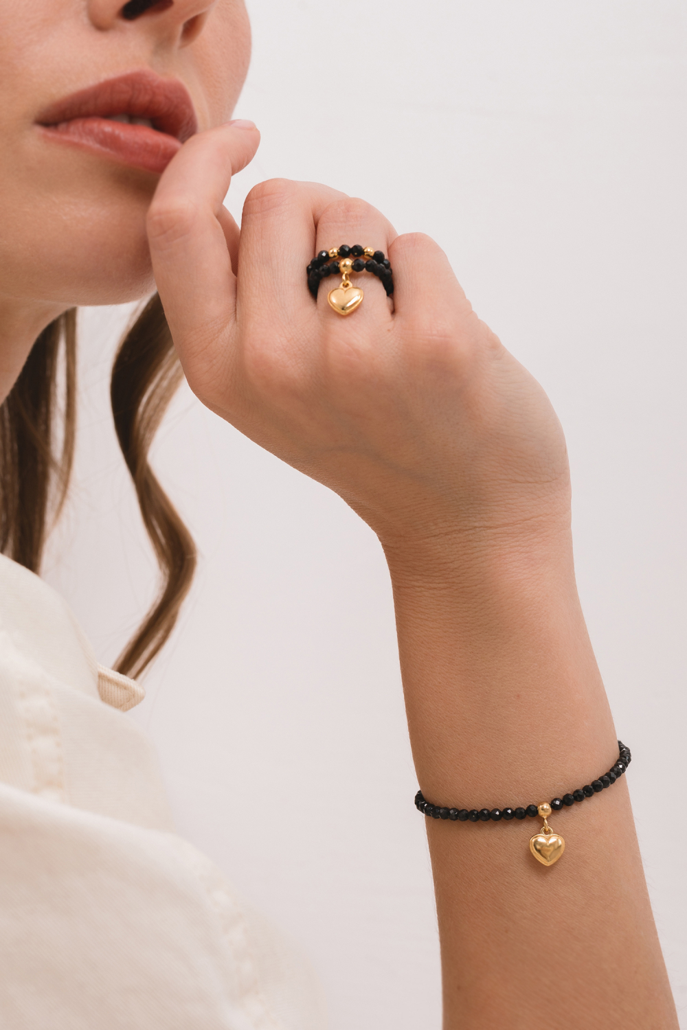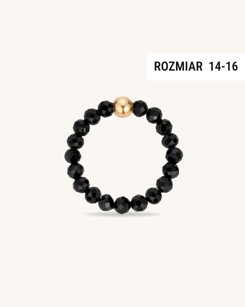 Pierścionek wykonany jest z naturalnych spineli o głębokiej, czarnej barwie, których fasety pięknie odbijają światło i nadają niezwykłego blasku. Kamienie w pierścionku są nawleczone na silikonową gumkę, dzięki czemu pierścionek idealnie dopasuje się do Twojego palca.