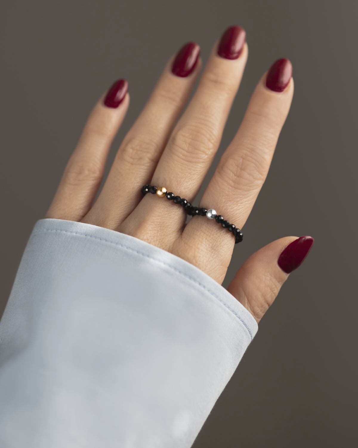 Pierścionek wykonany jest z naturalnych spineli o głębokiej, czarnej barwie, których fasety pięknie odbijają światło i nadają niezwykłego blasku. Kamienie w pierścionku są nawleczone na silikonową gumkę, dzięki czemu pierścionek idealnie dopasuje się do Twojego palca.